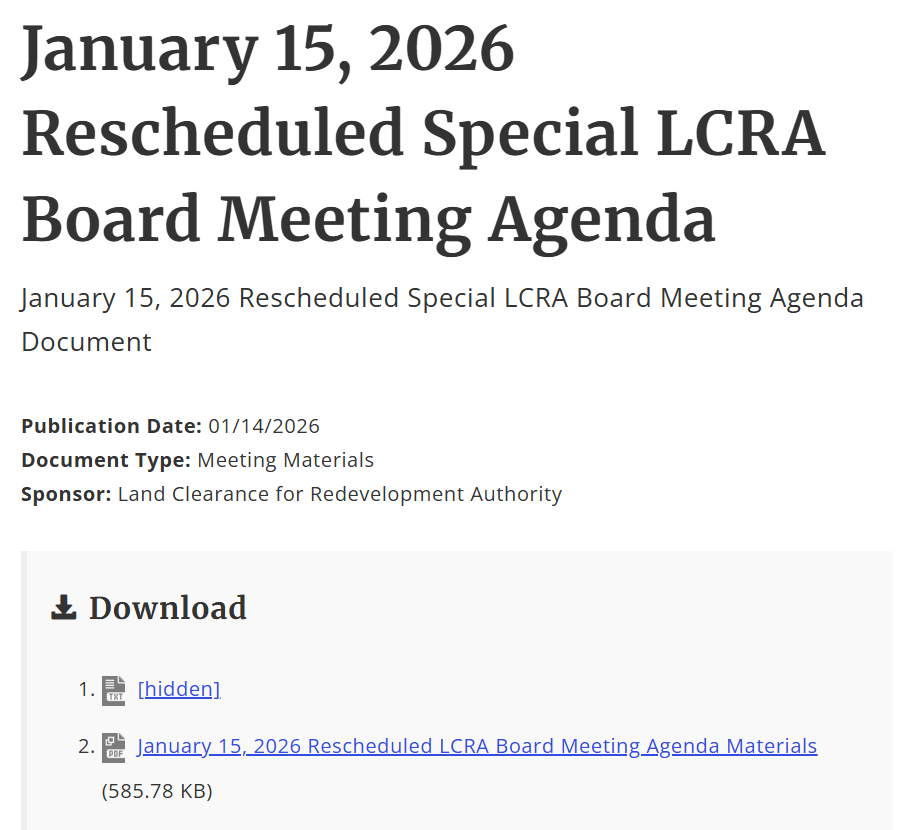 The notice was for a meeting a week later. 10:30 am Thursday, January 15th, there was to be a “Special” meeting (meaning not a regular weekly or monthly meeting), Zoom only, of the Land Clearance for Redevelopment Authority (LCRA) Board.